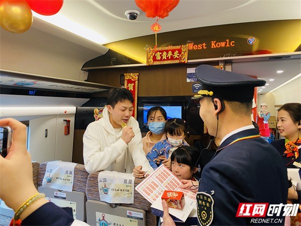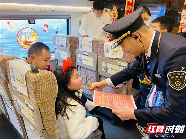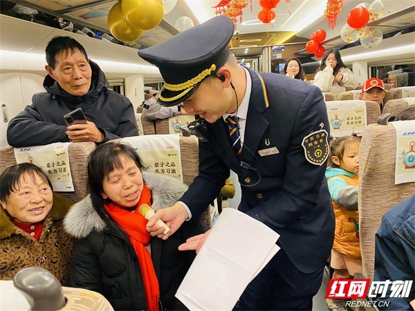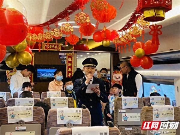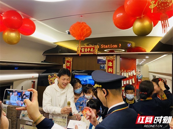 “车长车长:我和妹妹想说两句祝福,一愿在龙年里,家人身体健康、万事顺心;二愿我和妹妹在龙年里取得好成绩,更上一层楼;三愿列车员叔叔大哥哥大姐姐们在龙年家庭幸福美满、生活越来越好!”一位从郴州前往香港西九龙的小伙子陈先生带着妹妹一起前来参与。拿着列车长郑德强递过来的话筒,他以“龙”字为韵,连续说出了自己几个新年愿望。