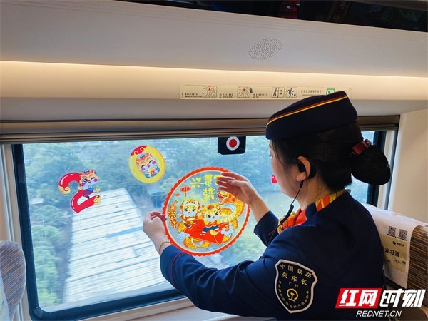 2024年2月9日,农历大年三十。在G6113次列车上,列车员贴对联、挂灯笼、粘窗花、挂心墙,将车内布置得红红火火、喜气洋洋。在这趟开往香港西九龙的列车上,将要举办一场“瑞兔辞旧去、龙腾迎新来”迎新贺岁联欢活动。