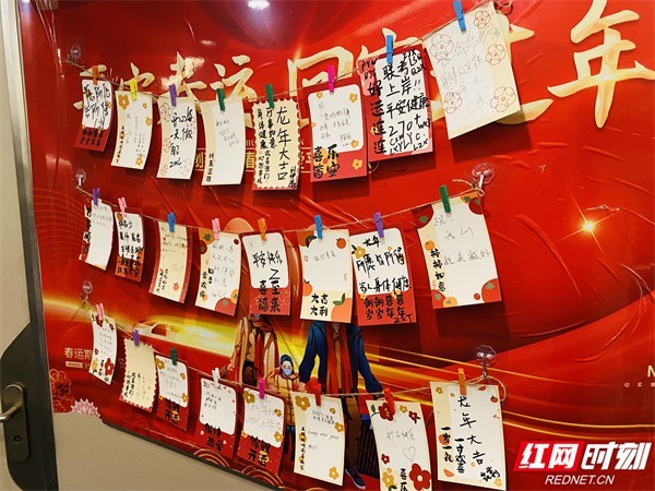 在这面墙下,旅客齐聚一起。不分老少,无论南北,大家纷纷满怀期待地提起笔来,将自己最为真挚的新年祝福写在许愿卡上,祈愿在甲辰龙年新年好运。没过多久,墙上已经挂满了整整一面的“心愿”和“祝福”。在车厢内,大家几句一起,齐声高喊“新年快乐、龙年大吉”的祝愿并合影留念,一起记录下此刻的美好。