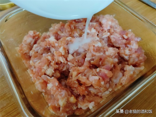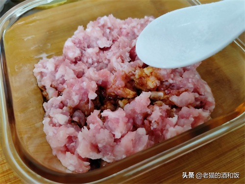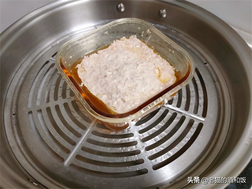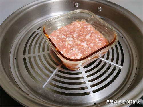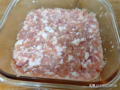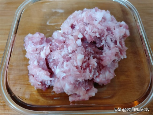 1、猪肉洗净切小块,用绞肉机绞成肉泥。找一个耐热容器,把猪肉泥放进来。不用绞得太细,稍微有点点颗粒感,会更有嚼劲呢。如果家里没绞肉机,买的时候可以让老板处理好,或者用刀剁也可以。