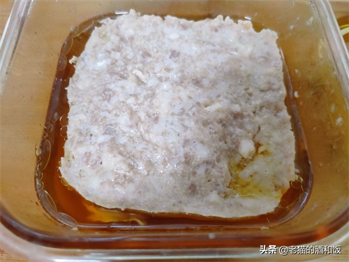 3、搅拌均匀之后,用勺子把肉泥压实。