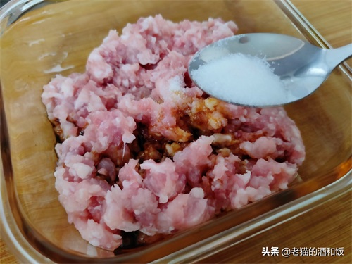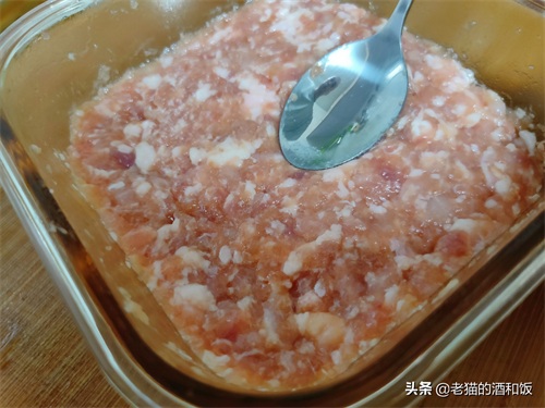 2、依次加入:生抽、盐、白糖,拌匀之后再加:食用油、水淀粉。我家用的是玉米淀粉,其他淀粉也可以的,为了让肉泥更好的成团。