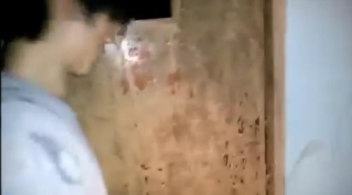 我们仔细观察视频中白衣男子的动作,就可以清楚地发现:白衣男子是先低头,看往下方,然后门对面下方才传来了奇怪的声音。