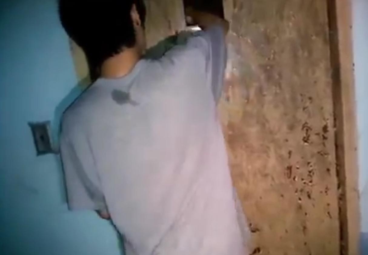 两个主播来到206房间的门口,门打不开,白衣男就把手伸入门上的小窗口,但是依旧没有打开。