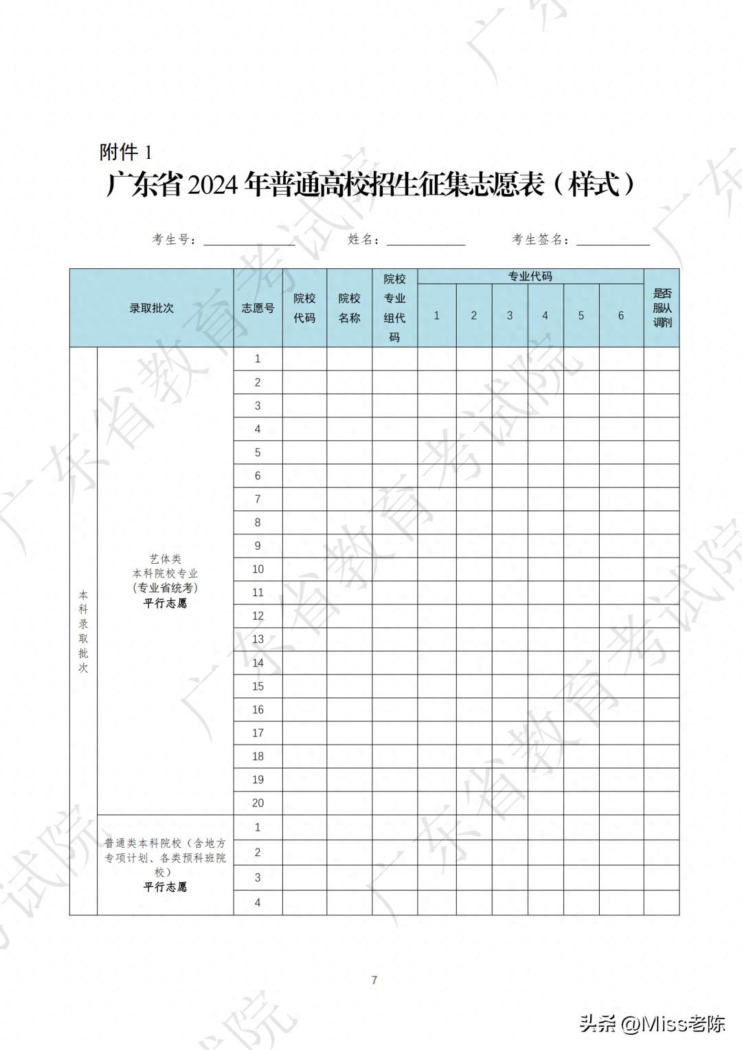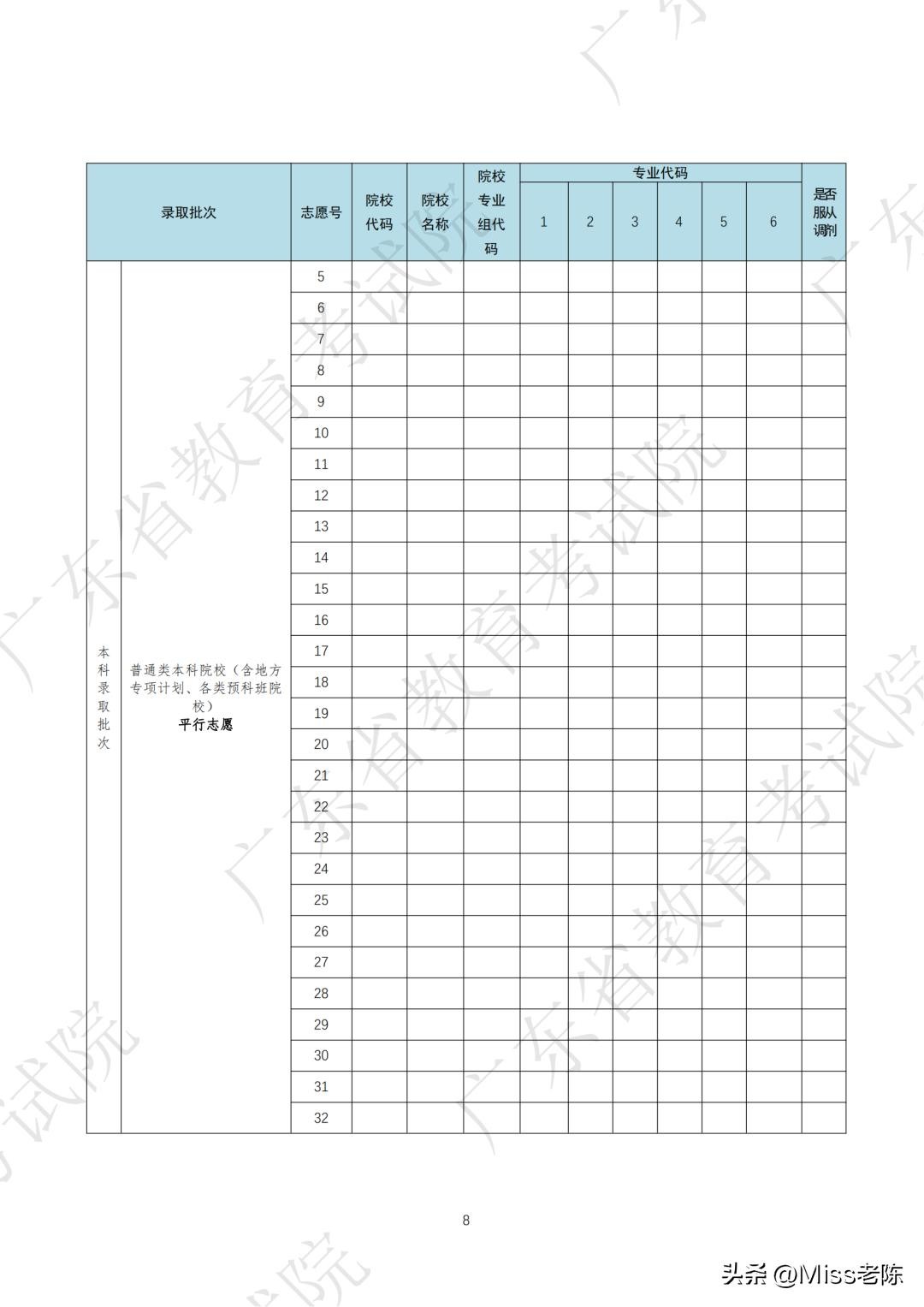 四、广东省2024年本科批次征集志愿表(样式)