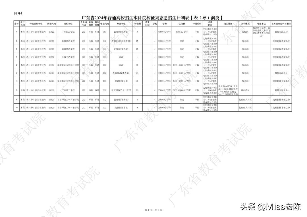 9、广东省2024年普通高校招生本科院校征集志愿招生计划表【表(导)演类】