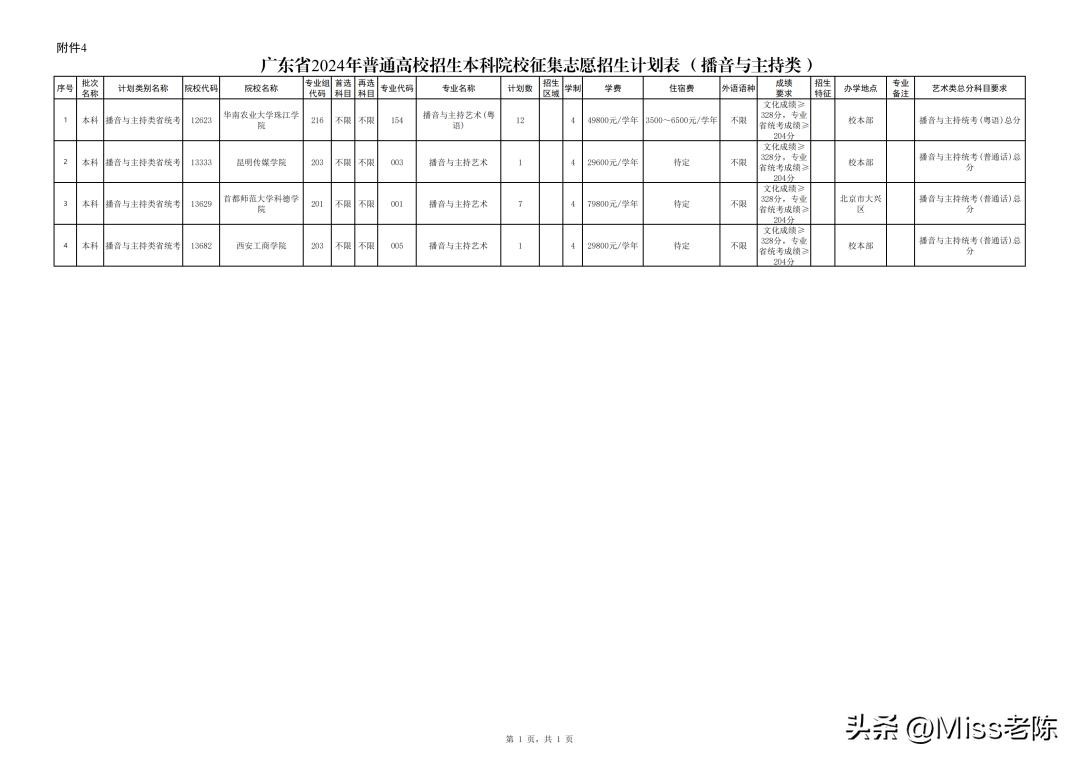 8、 广东省2024年普通高校招生本科院校征集志愿招生计划表(播音与主持类)