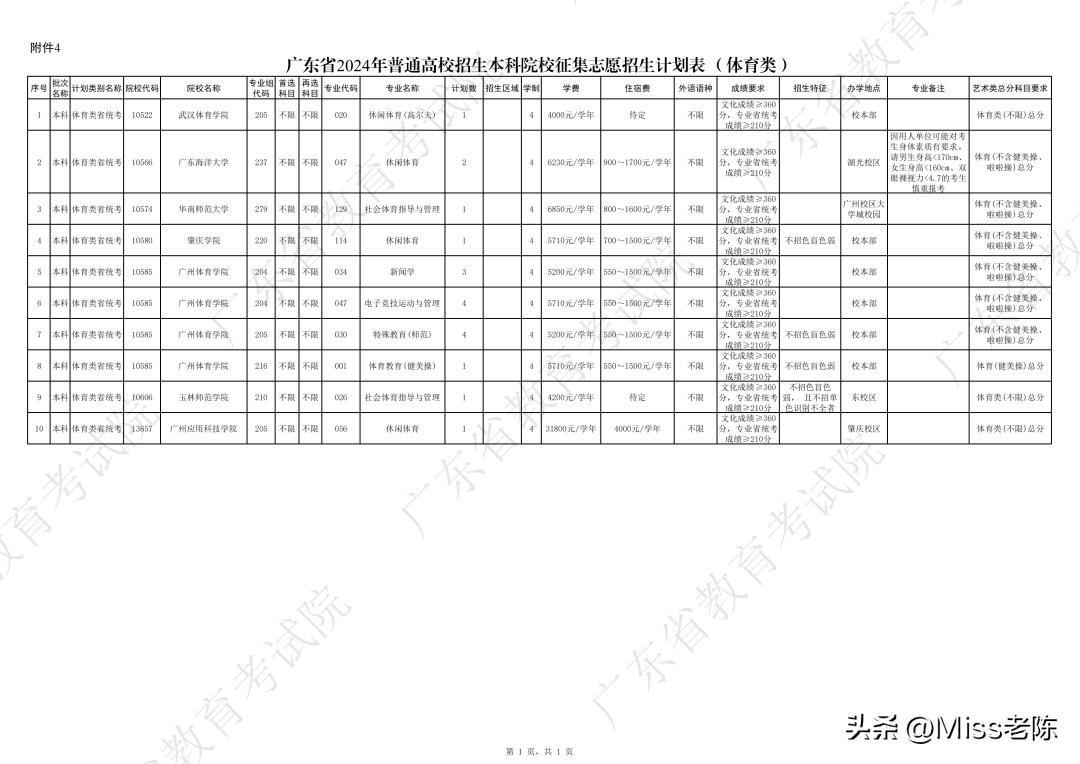 3、 广东省2024年普通高校招生本科院校征集志愿招生计划表(体育类)