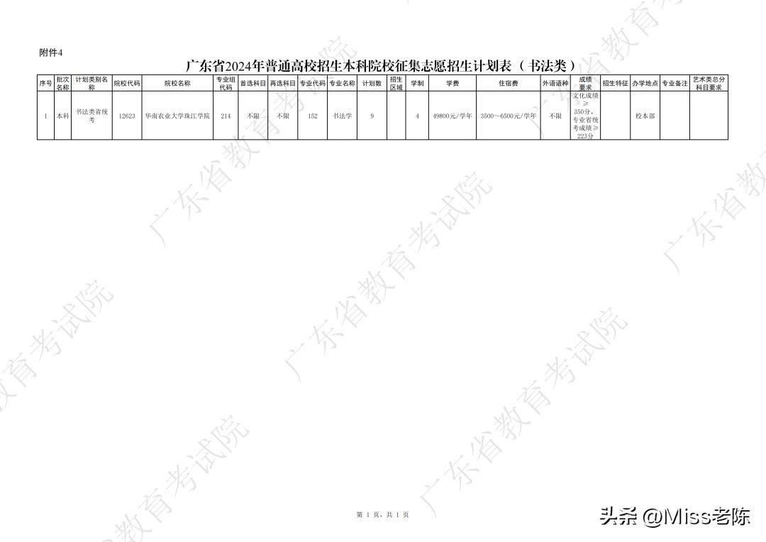 7、 广东省2024年普通高校招生本科院校征集志愿招生计划表(书法类)