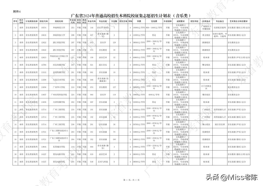 5、 广东省2024年普通高校招生本科院校征集志愿招生计划表(音乐类)