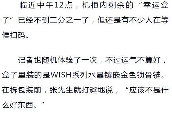 “去年9月,‘幸运盒子’刚刚入驻商场时,过来扫盒子的人超级多,络绎不绝,每次都要排队!”小王向记者描述了当时的火爆程度。但现在扫盒子的人,已经少多了,“一个原因是扫不出什么值钱东西,另一个原因就是大家已过了新鲜劲。”