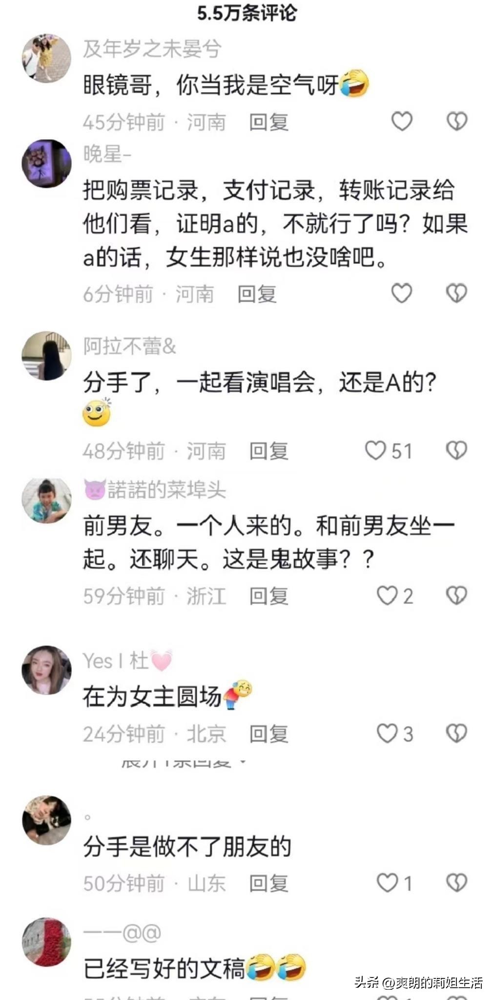男主的澄清:演唱会结束后,眼镜男选择发布澄清视频,声称自己与女主是前男女朋友关系,去年3月分手,并且演唱会门票是AA购买的。然而,这一澄清并未获得所有人的认可,有人质疑他的真诚和诚信。
