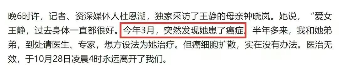 据王静的母亲钟女士透露,今年三月份, 王静身体很不舒服去医院体检,拍片子出来显示她患了癌症,并且已经是晚期了。