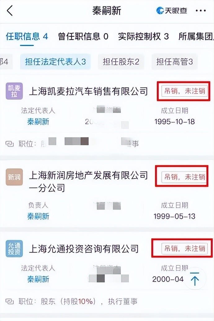 万能的网友就开始深挖其身份,从天眼查里面的信息显示,秦嗣新曾担任过三家公司法人,但现在都处于“吊销未注销”状态。