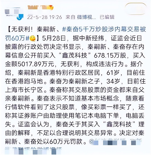 5月29日,一则“秦嗣新、秦奋父子内幕交易鑫茂科技被罚60万”的新闻迅速炸开,一时间所有传言秦奋身世云破天开。网友:“终于知道他的爸爸是谁了”“感谢证监会帮我们揭开谜底”“原来和思聪不是一个等级的”