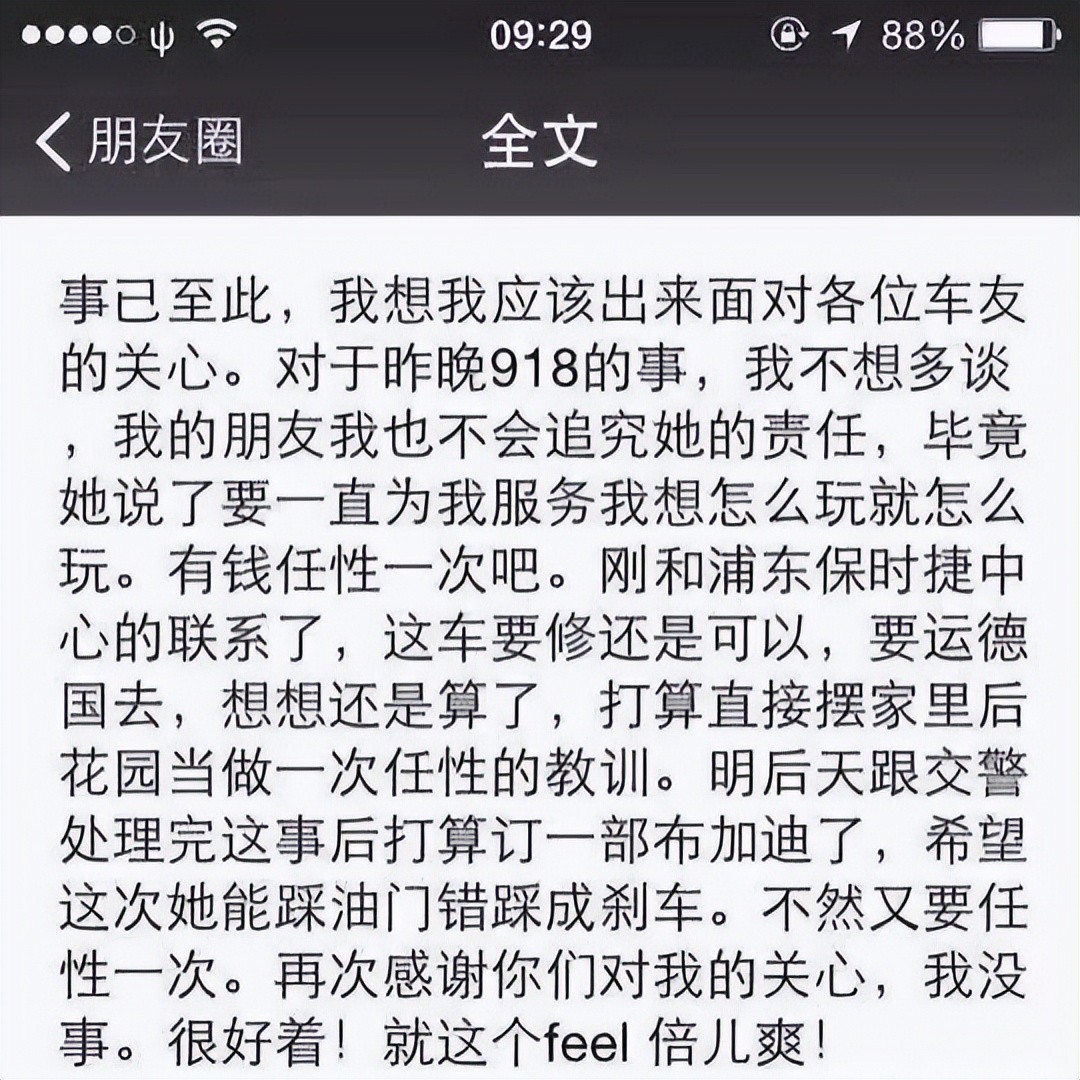 随后秦奋地回复道”车无所谓,人没事就好“,后得知维修费用要几百万,秦奋也不打算修了,放在豪宅花园里做装饰品,真是豪的豪无人性!