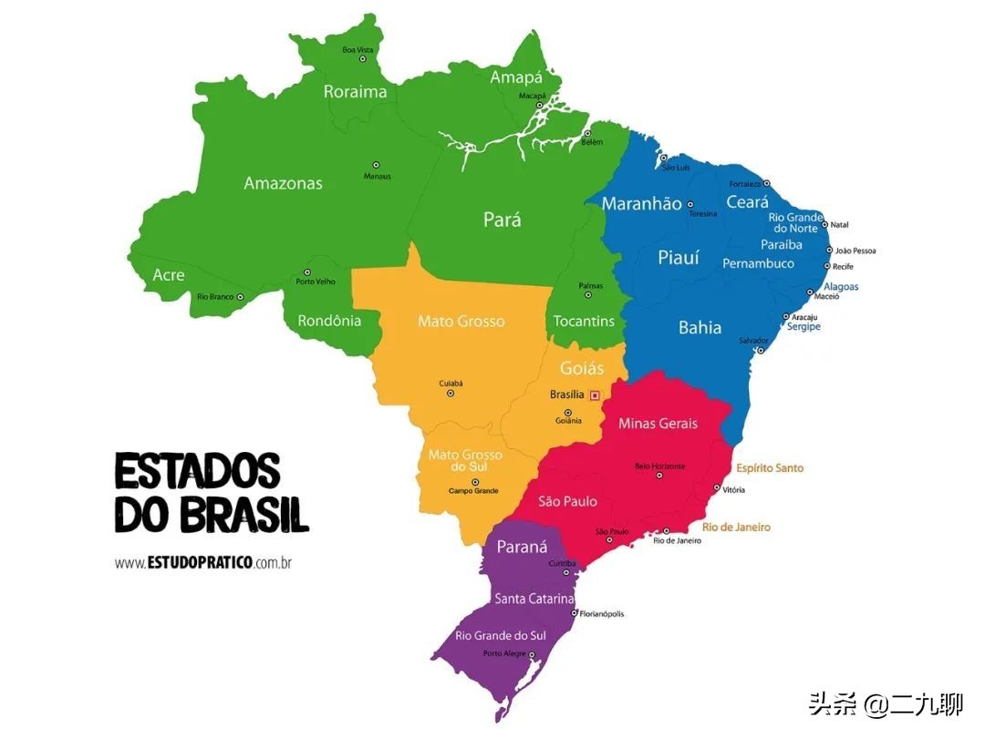 巴西区域地图,黄蓝绿红紫分别对应中西,东北,东部,东南和南部地区。