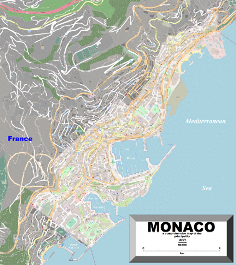从下面地图中可以看出,摩纳哥公国的形状是一个南北狭长的地带,也是一个典型的沿海国家。