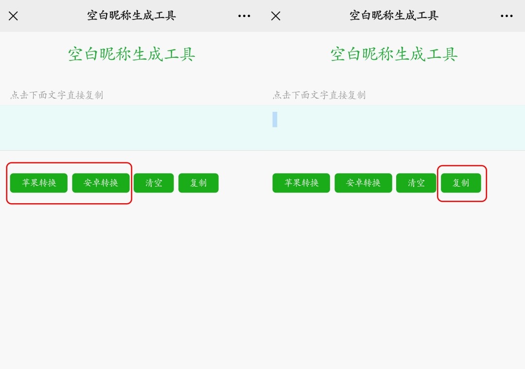 首先打开这一空白昵称生成工具,直达地址获取方法在文末。然后直接点击“苹果转换”或者“安卓转换”按钮,点击之后稍等一会儿,再之后点击最右侧的“复制”。