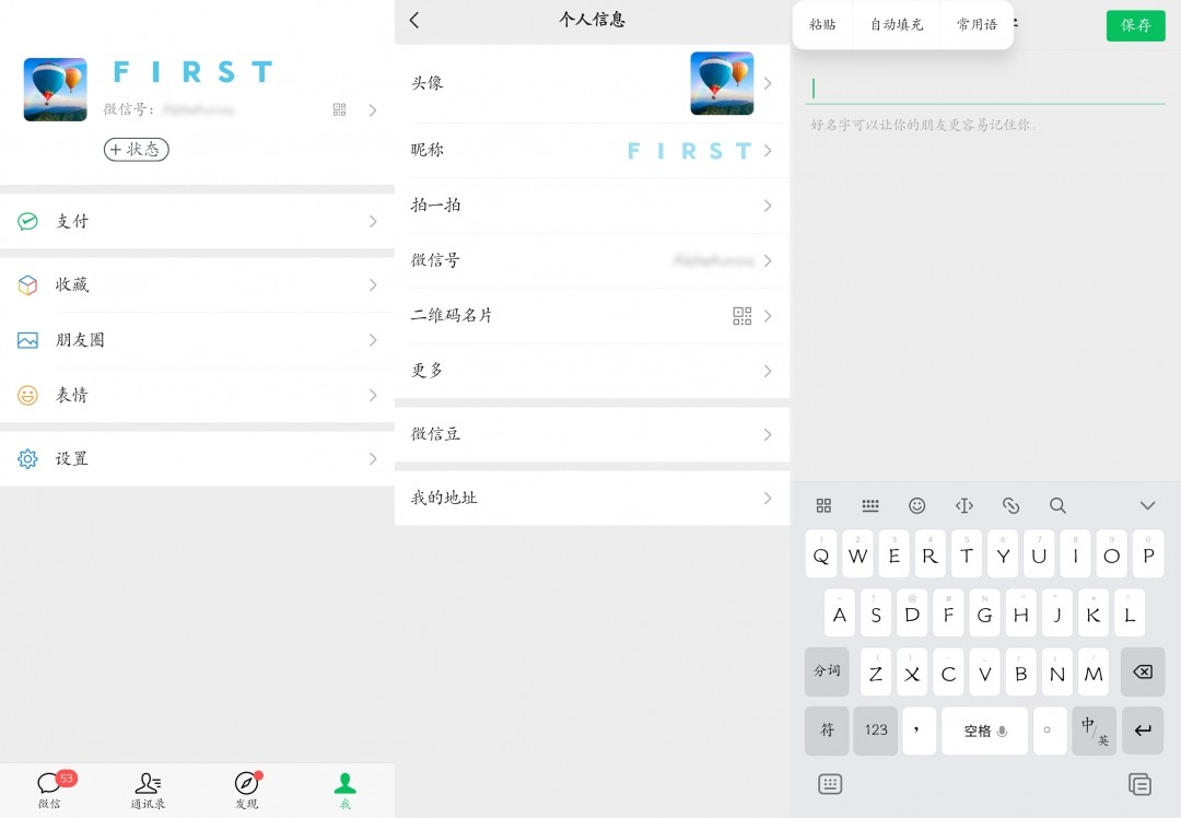 回到自己的微信个人主页,进入个人信息页面,开始更改昵称,在输入框中粘贴刚刚复制的内容,最后点击“保存”退出修改就可以啦!
