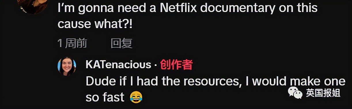Katherine的故事让全球网友大为震撼,有人表示这事儿这么抓马,绝对应该拍成纪录片。