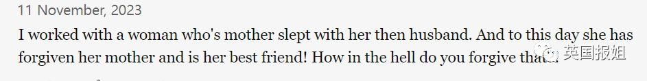 “我曾经的一个同事就是这样,她丈夫和她妈睡了,如今她已经原谅了她的母亲,还成了她最好的朋友,也不知道到底是怎么能原谅的。”