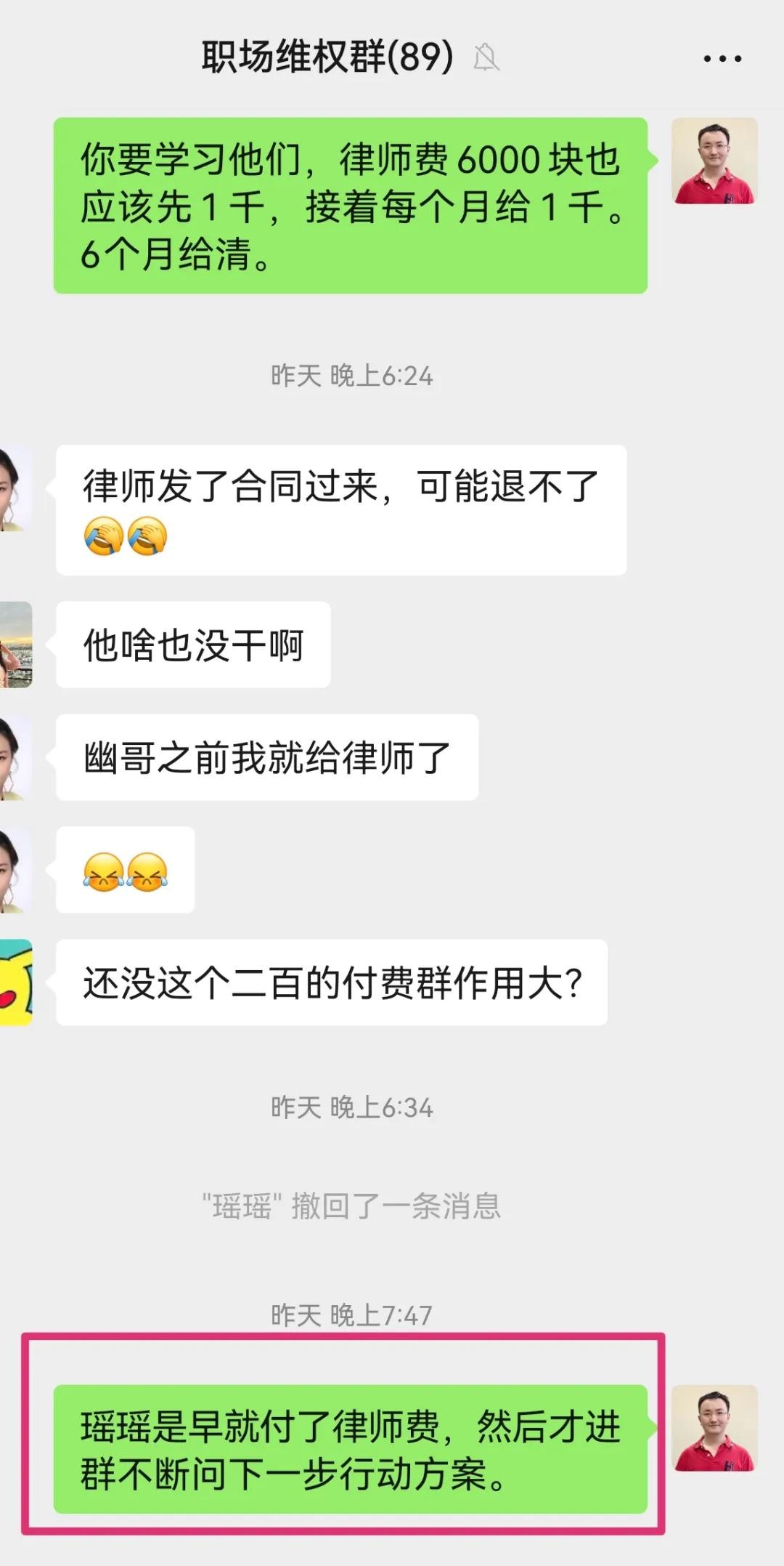 如下大家做个参考,这位群友付了6000块给律师帮助自己仲裁。但是她主要通过来问我和群友,获得了建议,用病假、举报信等方式倒逼人事经理来跟她谈赔偿,最终将0赔偿谈成了2.5个月,这就不需要仲裁了。