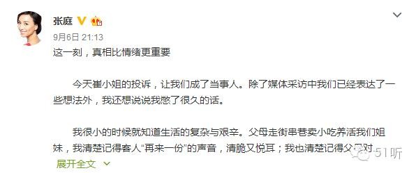 张庭在微博上发长文回应这件事,