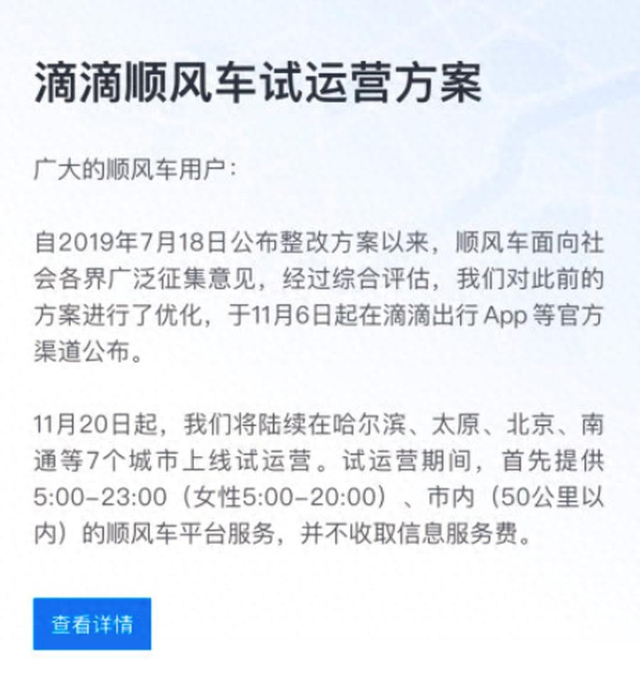 11月6日消息,滴滴顺风车服务在经过一年多的整改后,终于迎来新进展。今日,滴滴官方发布的一条公告显示,滴滴顺风车将于11月20日重启,之后会陆续在哈尔滨等7个城市试运营,并且在试运营期间将不收取信息服务费。