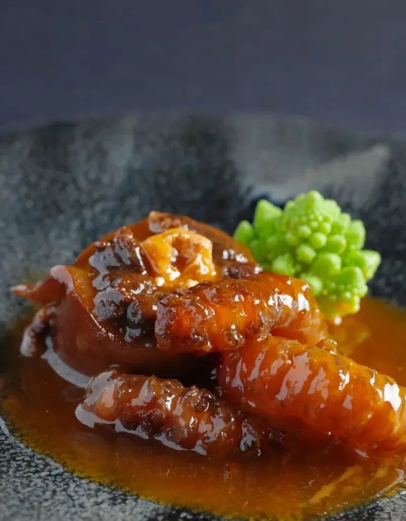 3、鲟龙鱼筋飞水,入锅微火加牛尾汁浸煮20分钟,至上色入味,备用。