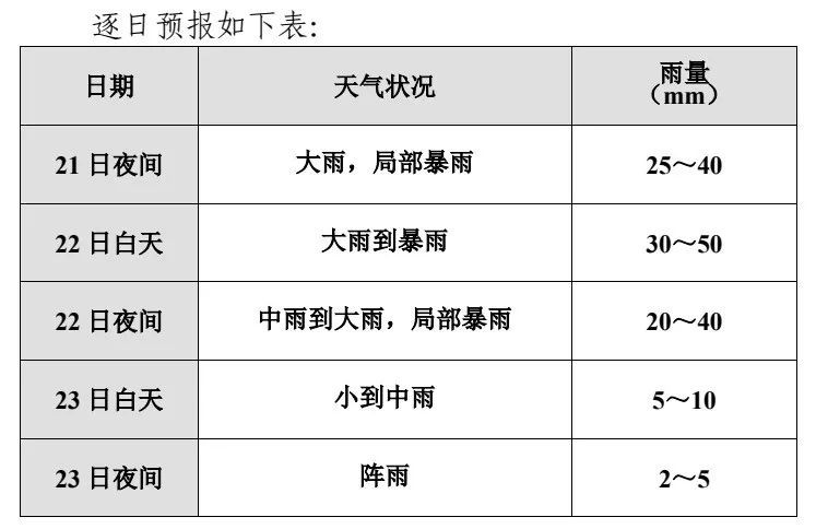 暴雨预警:受冷暖气流共同影响,预计今天夜间—23日我市有暴雨天气,主要降水时段出现在今天夜间至明天白天。全市过程累计雨量60—100毫米,局部可达120毫米(见附图)。最大小时雨强50毫米。降水时可能伴有强雷电、短时强降水、8—11级大风、局地小冰雹等强对流天气。