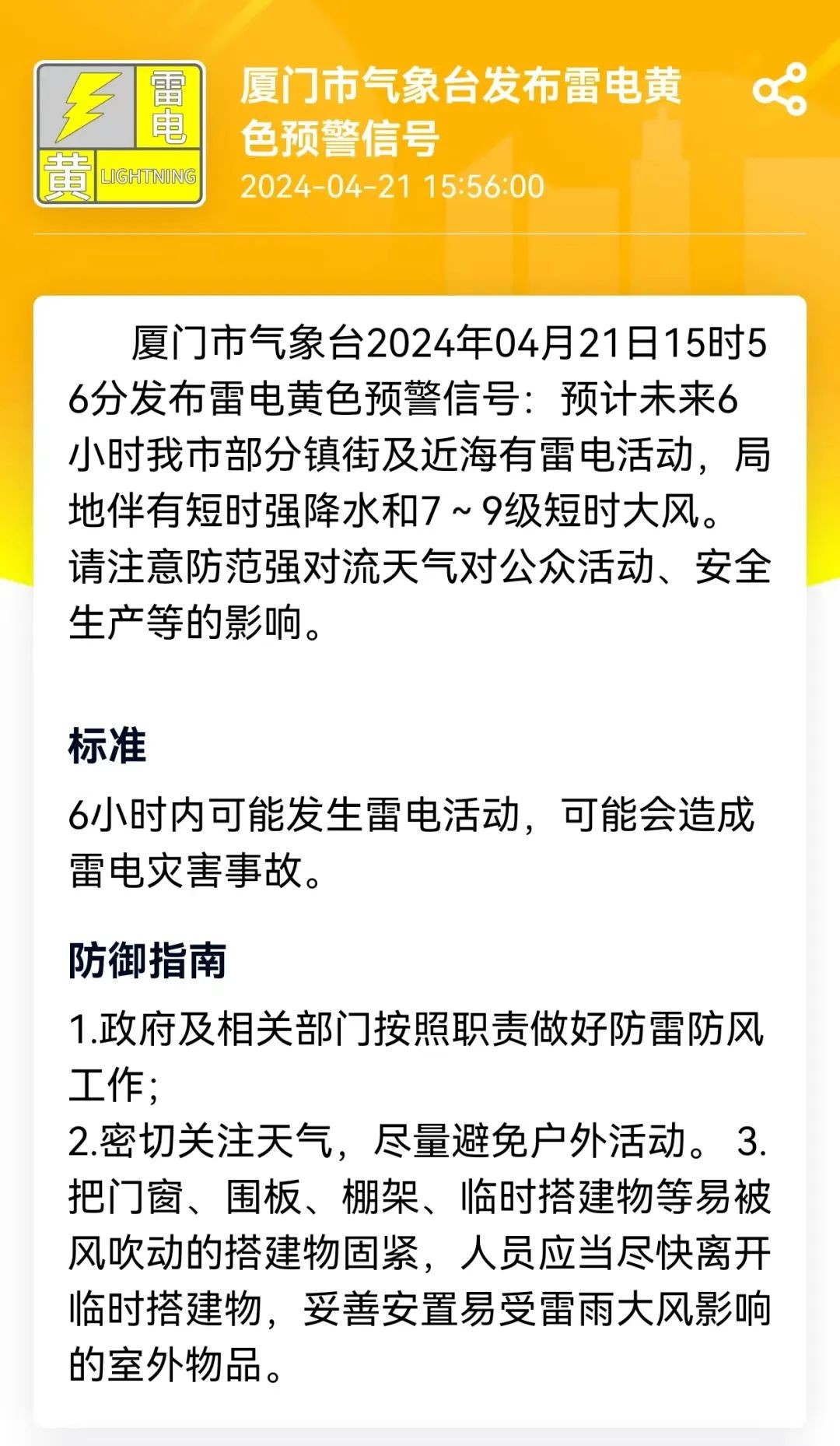 雷电黄色预警信号