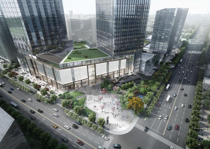 苏州金地广场南临泰华商城、北到新市路,总建筑面积约11.46万平方米,分为地上4层、地下4层,目前主体结构已全部封顶,外立面已完整呈现。