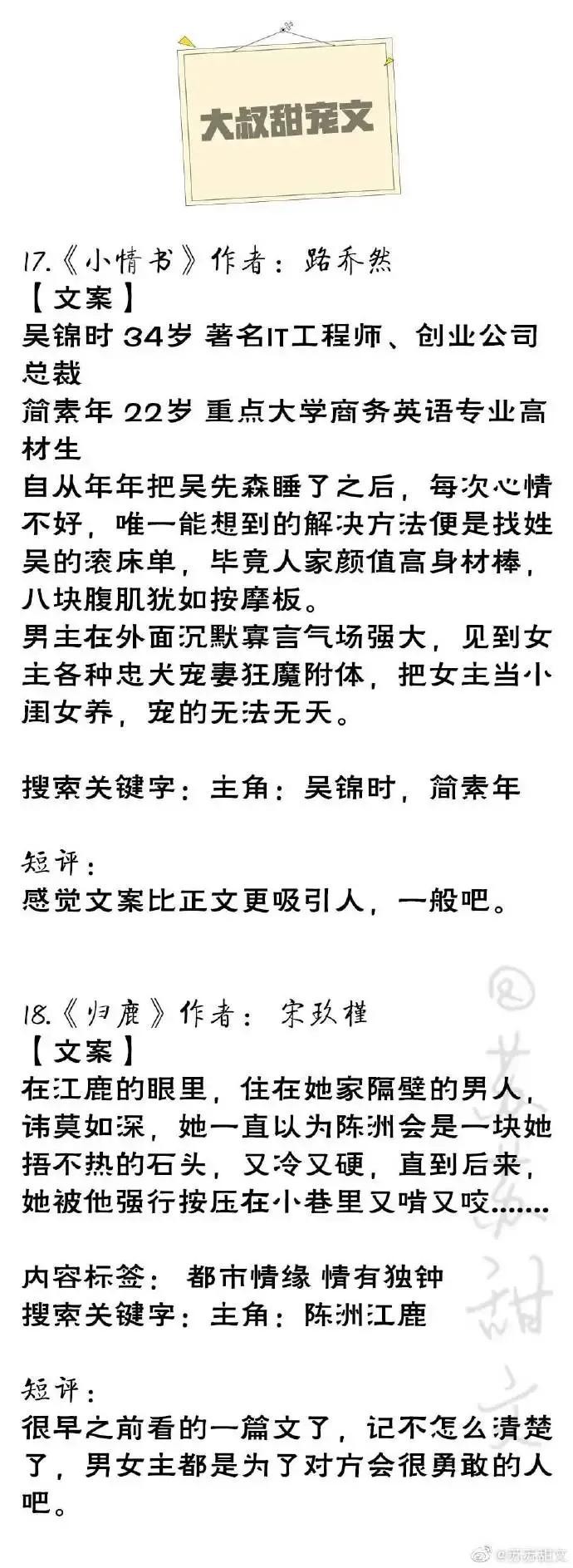 喵喵陈的《狐狸叔叔》太甜了,太好看了!男主比女主大十岁,女主爷爷和步老爷子是战友,女主父母去世,和妹妹一起住在姨家,姨对她们非常刻薄,女主姨欺负她,男主实力护妻,帮助女主讨回公道。男主和男主侄子都喜欢女主,奈何女主一心扑在痞子大叔身上啊。男主真是又痞又撩啊,看得人春心荡漾啊,安排安排。