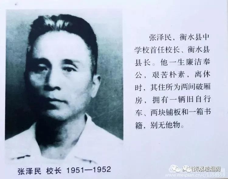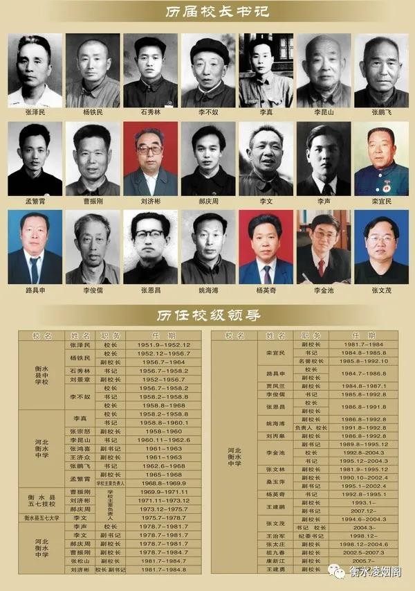河北衡水中学创建于1951年,当初定名为衡水县初级中学,校长由当时的衡水县县长张泽民兼任。1955年,衡水县初级中学发展到六轨制规模,杨铁民任校长,刘景章任副校长。