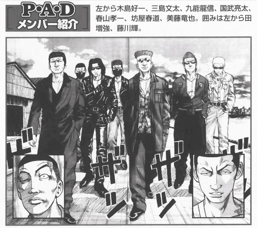 P.A.D的成员包括:铃兰“鸦魂”——坊屋春道,武装战线四代头目——九能龙信,凤仙当代最强——美藤龙也,以及武装战线麾下的亮太和文太,还有县南组合的贝鲁克、纪木、照三人,此外还有潜力新人田增强。