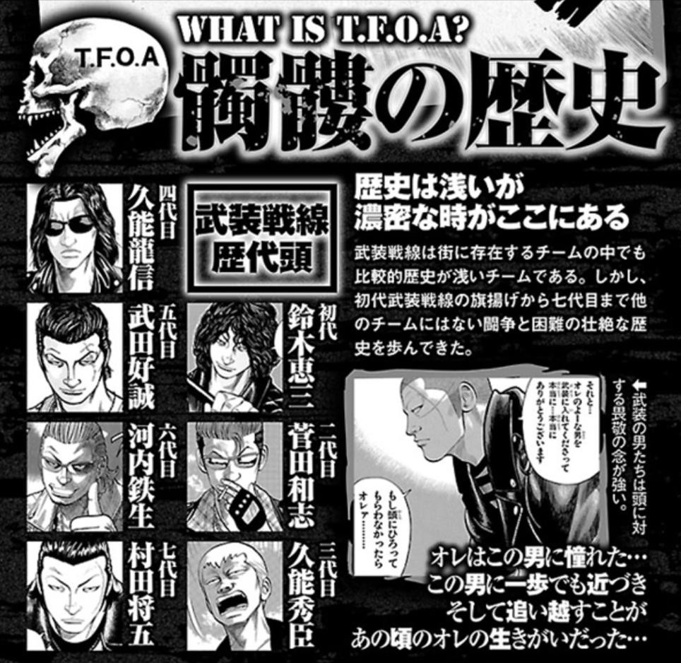 而黑焚联合的总长布鲁,凭借出色的实力,和铃兰的坊屋春道、凤仙的美藤龙也、武装战线的九能龙信并称为“四大天王”。