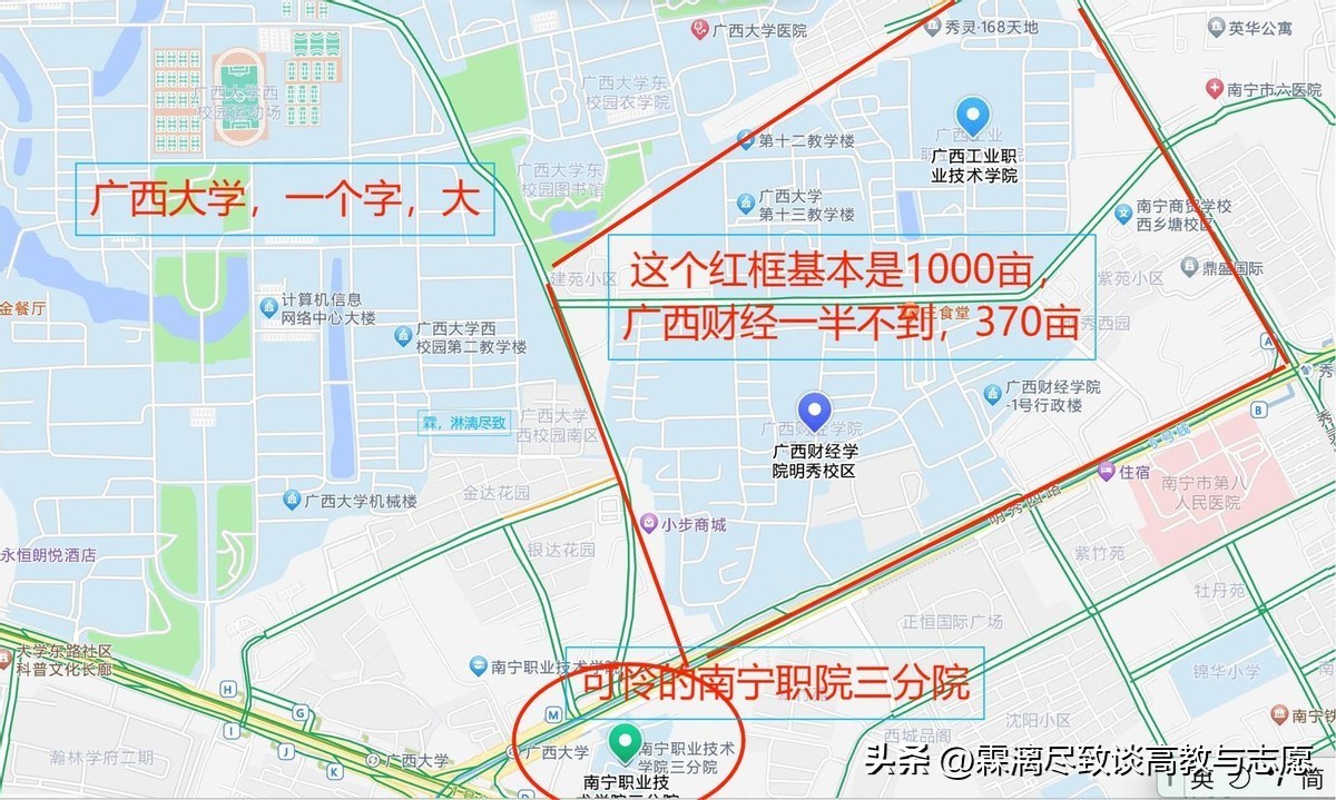 广西财经明秀校区在广西工业职院的南边,2个校区占据了一个大方块。一眼我就猜测这个校区不足500亩。西北方向是广西大学一哥广西大学。广西财政高专的历史说校区在明秀西路100号,广西商专说自己的校区在农院路8号,关键这两条路是那个区块的两条边啊。难道之前两个学校是屁股贴屁股的吗?挤在370亩的小地方办学吗?当然,边上还有委屈巴巴的南宁职院的三分院,和边上的五里亭第一小一样大。370亩,按现在的高校设置标准,办一个大专高职院校都不够。所以,广西人民办学,不容易的,广西的钱袋子,不饱满的。