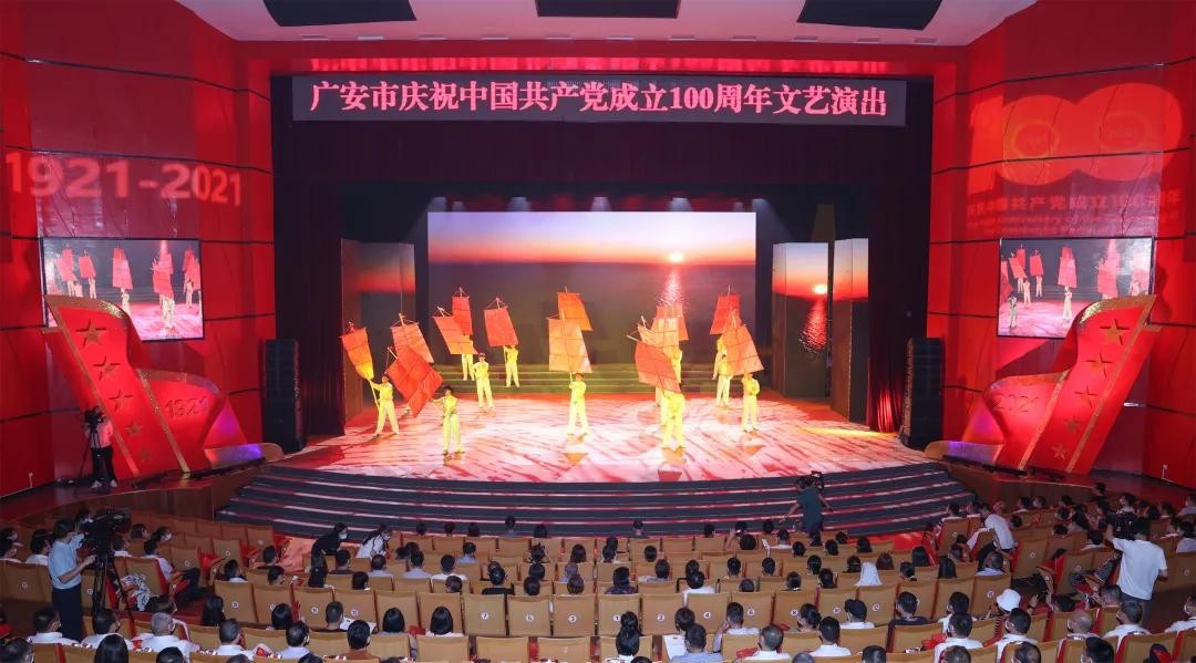 2021年6月29日,“奋斗百年路 启航新征程——广安市庆祝中国共产党成立100周年文艺演出”在广安精彩上演。晚会由《风云激荡》《激情年代》《春潮涌动》《复兴路上》4个篇章组成,通过舞蹈、合唱、情景表演、诗朗诵等多种艺术形式,礼赞中国共产党带领中国人民所取得的丰功伟绩。