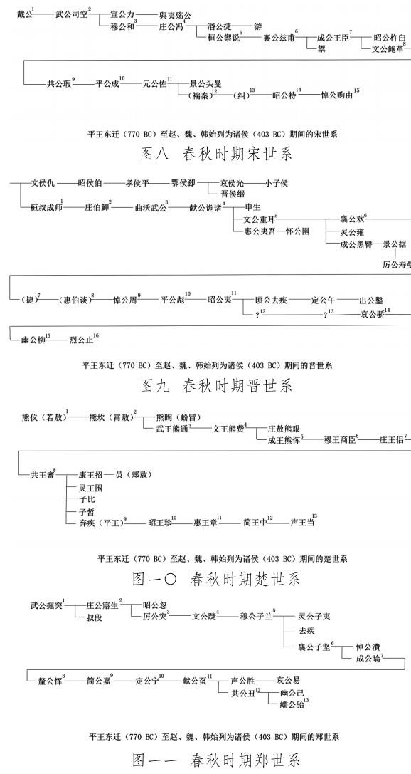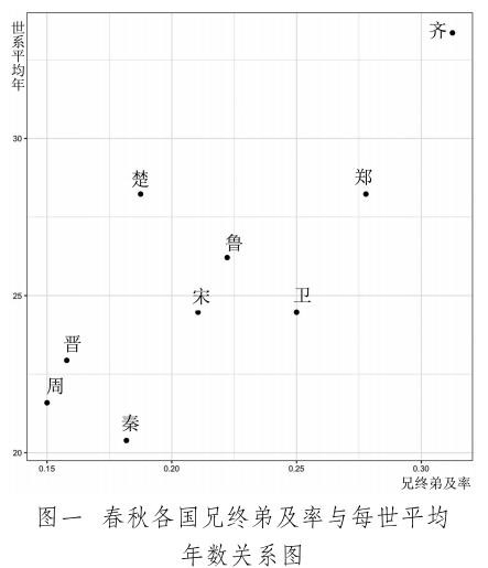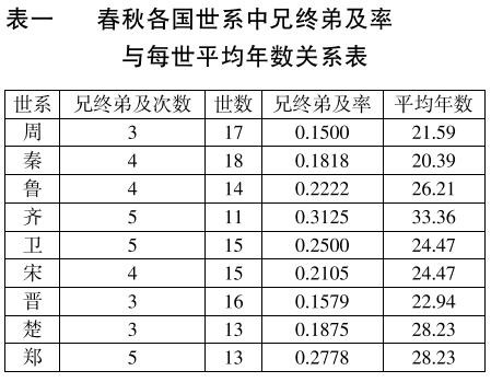 怀着这样的疑问,笔者依据《史记·十二诸侯年表》和《史记·六国年表》以及各个本纪、世家的记载,复原了东周时期周、秦、鲁、齐、卫、宋、晋、楚、郑等国[4]自平王东迁至韩、赵、魏始列为诸侯期间的详细世系(图三至图一一)。笔者发现世系中“兄终弟及”的次数不少,且兄终弟及的比率和每世的平均年数大致呈正相关。笔者首先定义了“主干世系” “兄终弟及”和“兄终弟及率”这三个概念。“主干世系”被定义为从第一代国君到最后一代国君的直线经过的世系,在附图中君主右上角标的数字即显示了该君主在“主干世系”中所处的世数,附图中的数字连起来构成了“主干世系”。“兄终弟及”被定义为父亲传给哥哥,哥哥再传给弟弟,弟弟传给了自己的儿子即一次兄终弟及。父亲传给哥哥,哥哥传给弟弟,弟弟再传给哥哥的儿子则不被定义为兄终弟及,因为这只是相当于哥哥的儿子延后了即位时间,本质上等同于哥哥直接传给儿子。此外,《史记》中记载了不少兄弟争位而哥哥没有当上国君即传给了弟弟的情况,这种情况可以等同于哥哥早夭,也算一次兄终弟及。“兄终弟及率”被定义为“兄终弟及”的次数除以“兄终弟及”次数与世数的加和,其反映了兄终弟及次数占兄终弟及次数和父死子继次数之和的比例。经过统计,笔者得到了表一所示的结果。笔者将兄终弟及率和每世平均年数均保留四位有效数字。每世平均年数为积年除以世数(即770-403 BC之间的积年除以世数)。