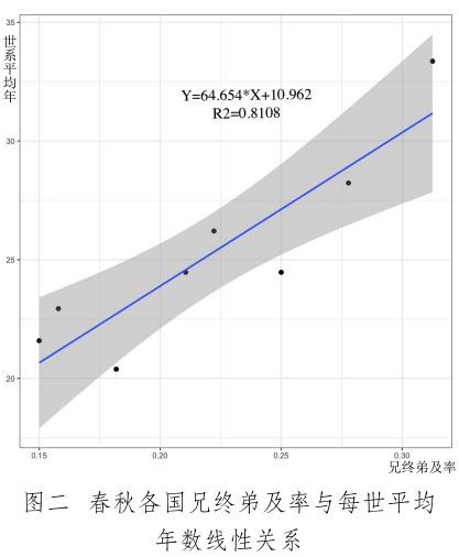 以兄终弟及率为横坐标,每世平均年数为纵坐标作图,可以得到图一。总体上看,随着兄终弟及率的增加,每世平均年数增加。楚国的情况比较异常,兄终弟及率只有0.1875而平均年数却高达28.23年。如果去除掉楚国,剩下的八个点可以构成较好的线性关系,如图二所示。通过使用Excel软件对八组数进行最小二乘法运算求解出线性回归方程,得到Y=64.654*X+10.962这样的回归方程,并且线性回归的相关系数R²为0.8108。