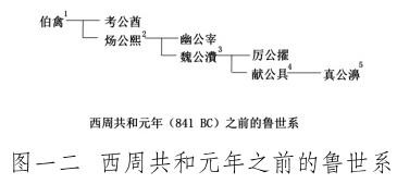 《史记·鲁世家》记载了鲁国从伯禽开始西周时期的详细世系,图一二所示为伯禽始封到841BC共和元年的鲁国国君世系。兄终弟及次数为3,世数为5,兄终弟及率为0.3750,根据上文得出的公式,每一世的平均年数为35.21年,5世积年为176年。据此可知伯禽始封约在1017BC,而武王克商年应据此时不远。