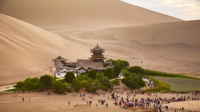 3. 鸣沙山月牙泉:位于敦煌市,是一片沙漠中的奇观。在黄沙滩上,有一个形状如弯月的湖泊,与周围的沙丘形成鲜明对比,令人叹为观止。