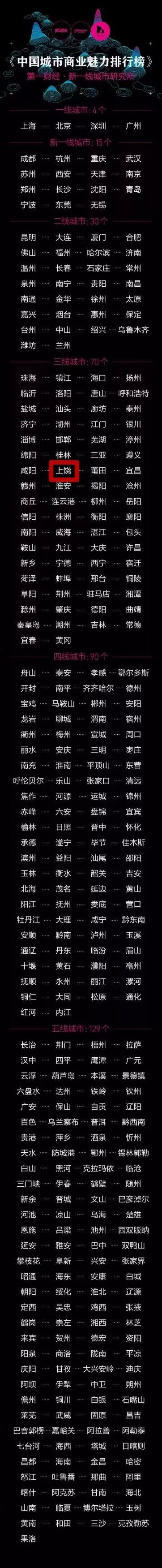 依据最新一年的170个品牌商业数据、19家互联网公司的用户行为数据及数据机构的城市大数据,第一财经·新一线城市研究所对中国338个地级以上城市再次排名,出炉《中国城市商业魅力排行榜》,咱大上饶位居三线城市。