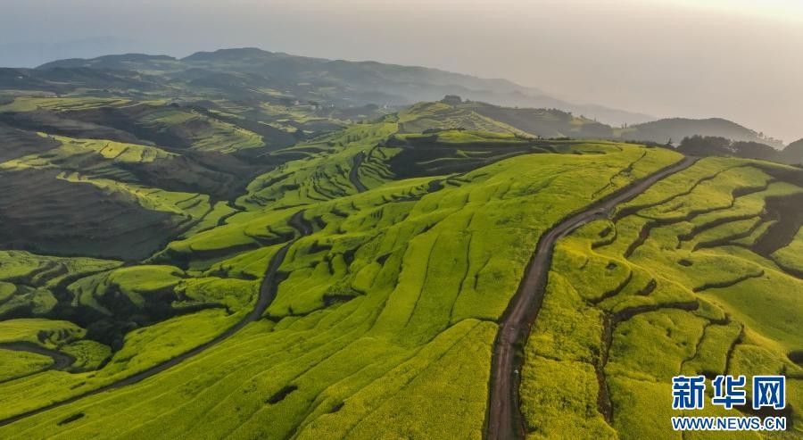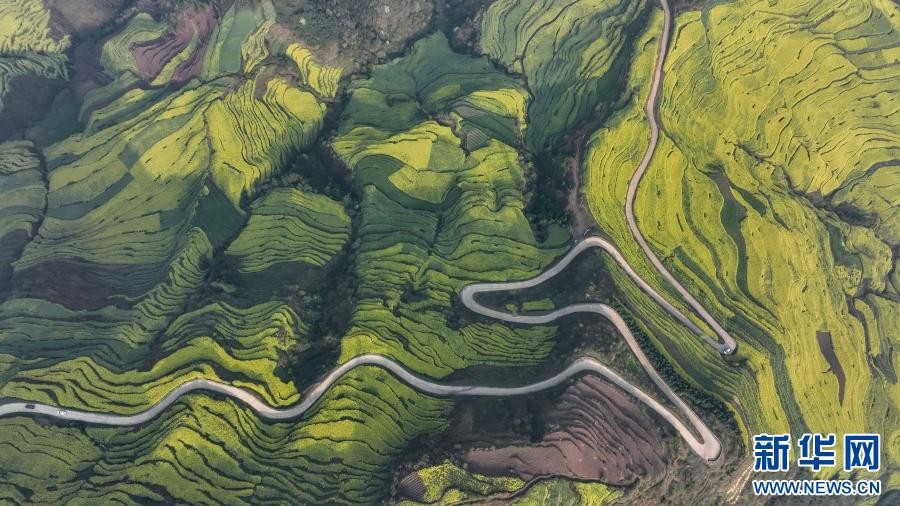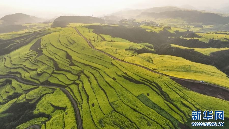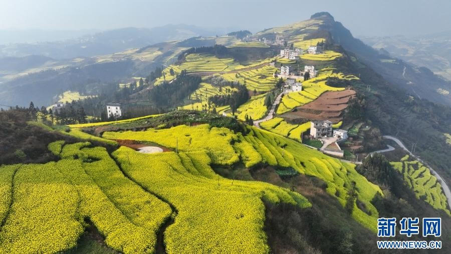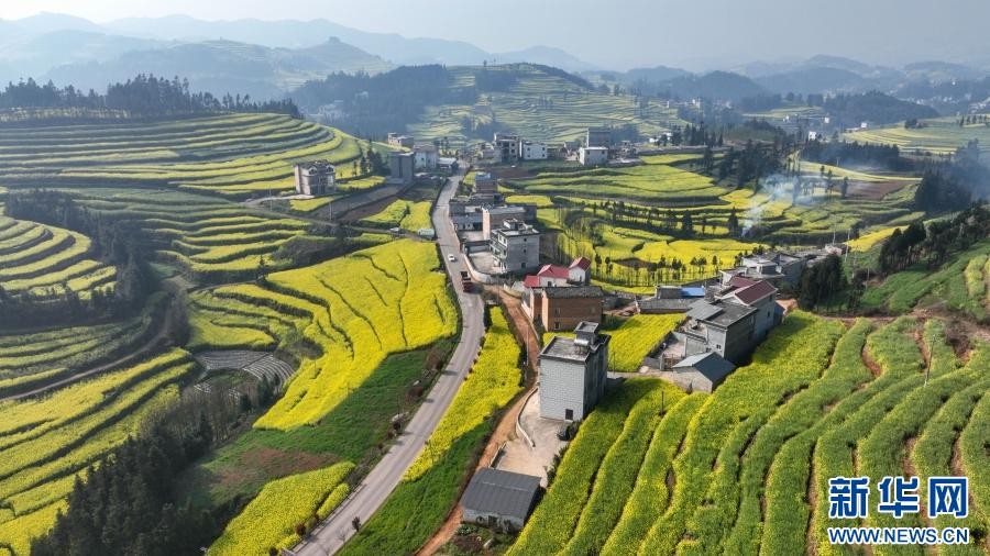 油菜花海与山峦、村寨、道路共同勾勒出一幅生机勃勃的田园画卷。新华网发(孙文来 摄)