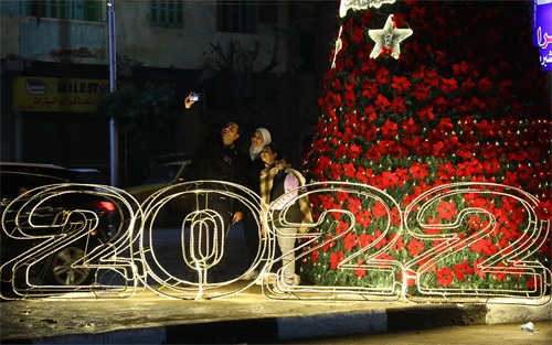 2021年12月31日,人们在埃及开罗街头的新年装饰前自拍合影。 新华社发(艾哈迈德·戈马 摄)