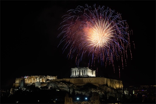 2022年1月1日,希腊雅典燃放烟花迎接新年。 新华社发(马里奥斯·罗洛斯 摄)