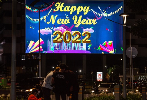 2021年12月31日,印度尼西亚雅加达街头的一块电子屏显示迎接新年的字样。 新华社发(维里 摄)