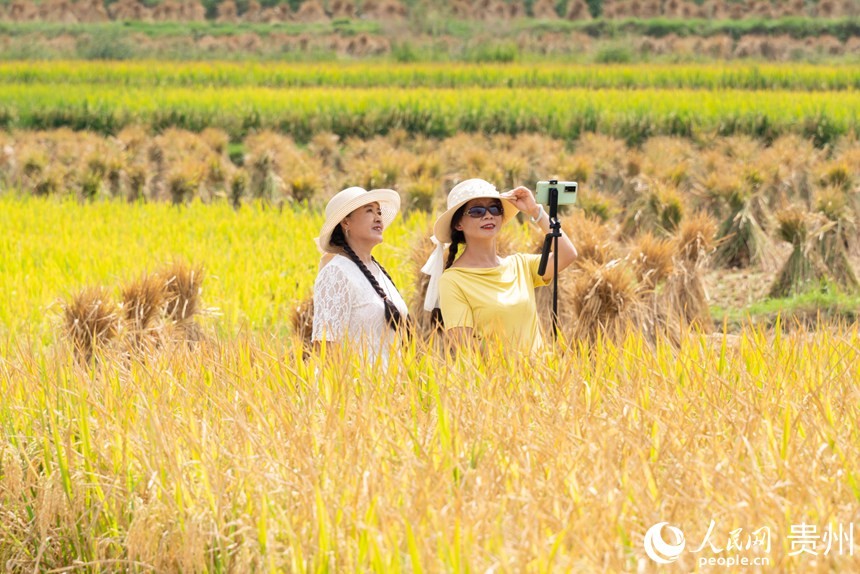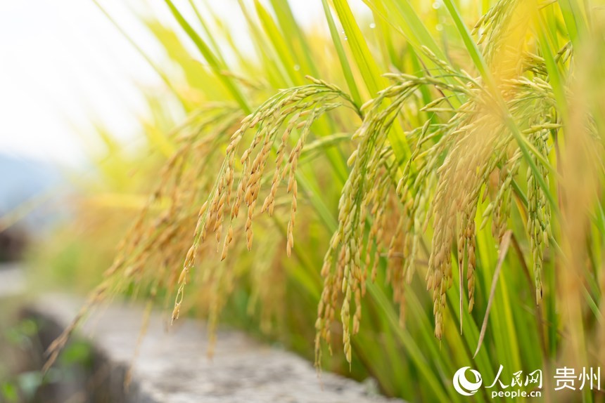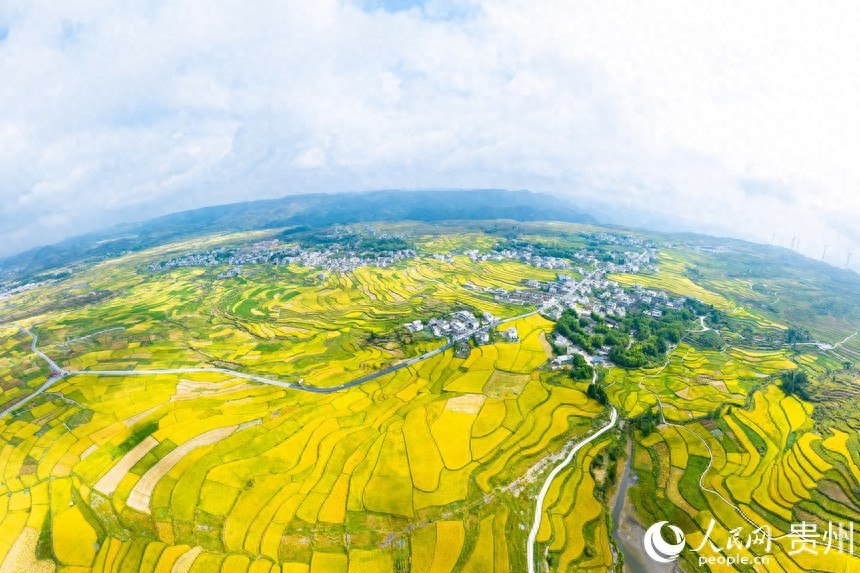 人民网贵阳9月14日电 (记者涂敏) 9月12日,贵州省贵阳市花溪区高坡苗族乡梯田内稻谷即将收获。层层叠叠的金黄色稻田与民居、乡村小道交相辉映,呈现一幅美丽的秋日画卷。