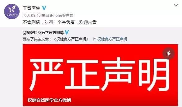 对此,12月26日上午,“丁香医生”官方微博转发该声明,并称“不会删稿,对每一个字负责,欢迎来告。”